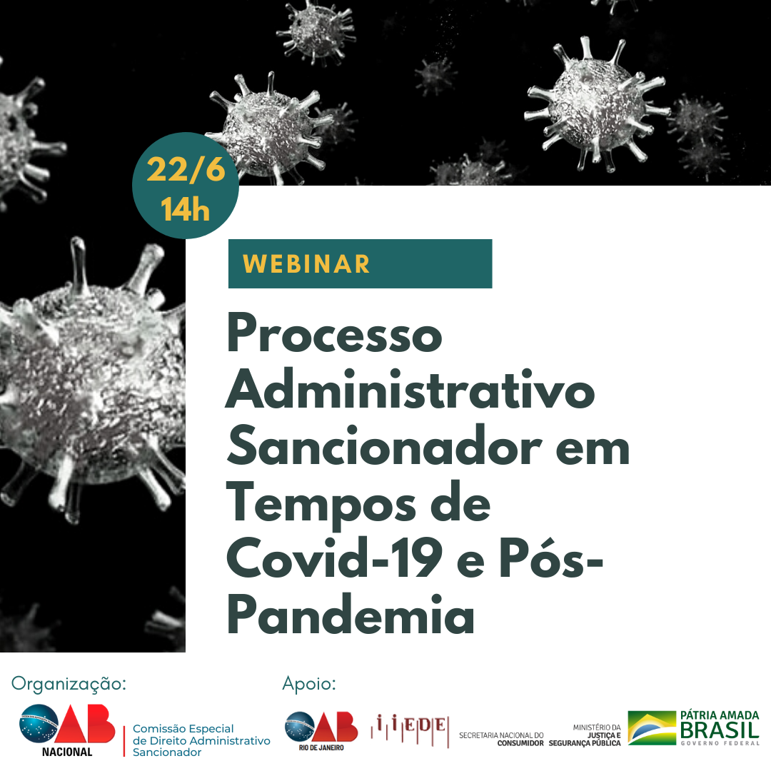 O webinar Processo Administrativo Sancionador em Tempos de Covid-19 e Pós-Pandemia, teve a organização da Comissão Especial de Direito Administrativo Sancionador da OAB Nacional e o apoio da Ordem dos Advogados do Brasil em sua seccional do Rio de Janeiro, do Instituto Internacional de Estudos de Direito do Estado e da Secretaria Nacional do Consumidor do Ministério da Justiça e Segurança Pública.